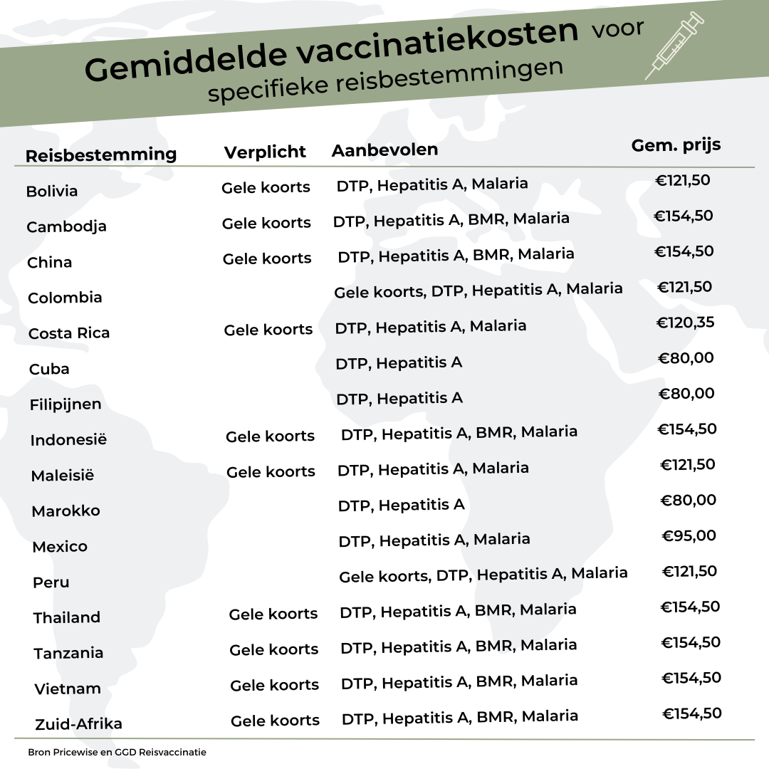 Check dan snel de infographic hieronder! Hierin kun je zien welke reisvaccinaties er verplicht zijn en welke worden aanbevolen voor verschillende reisbestemmingen. Natuurlijk is het altijd slim om daarnaast ook even bij de GGD of je huisarts langs te gaan voor extra info. Oh, en vergeet niet dat de kosten voor reisvaccinaties afhankelijk zijn van verschillend factoren, zoals de plek waar je ze krijgt, dus dus het is altijd verstandig om bij je huisarts of de GGD navraag te doen voor de meest recente informatie en adviezen over reisvaccinaties.
